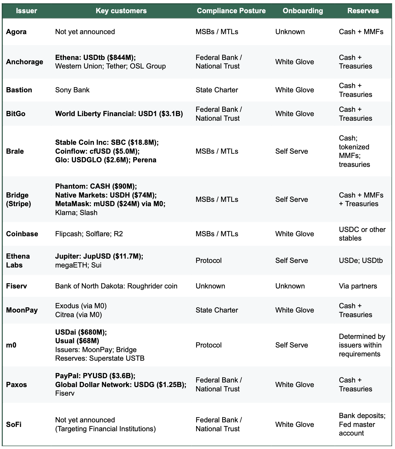 What’s enabling that shift is the proliferation of stablecoin issuance-as-a-service platforms. A few years ago, the shortlist was basically Paxos. Today there are 10+ credible paths depending on what you’re building, including newer platforms like Bridge and MoonPay, regulatory-first players like Anchorage, and large incumbents like Coinbase.